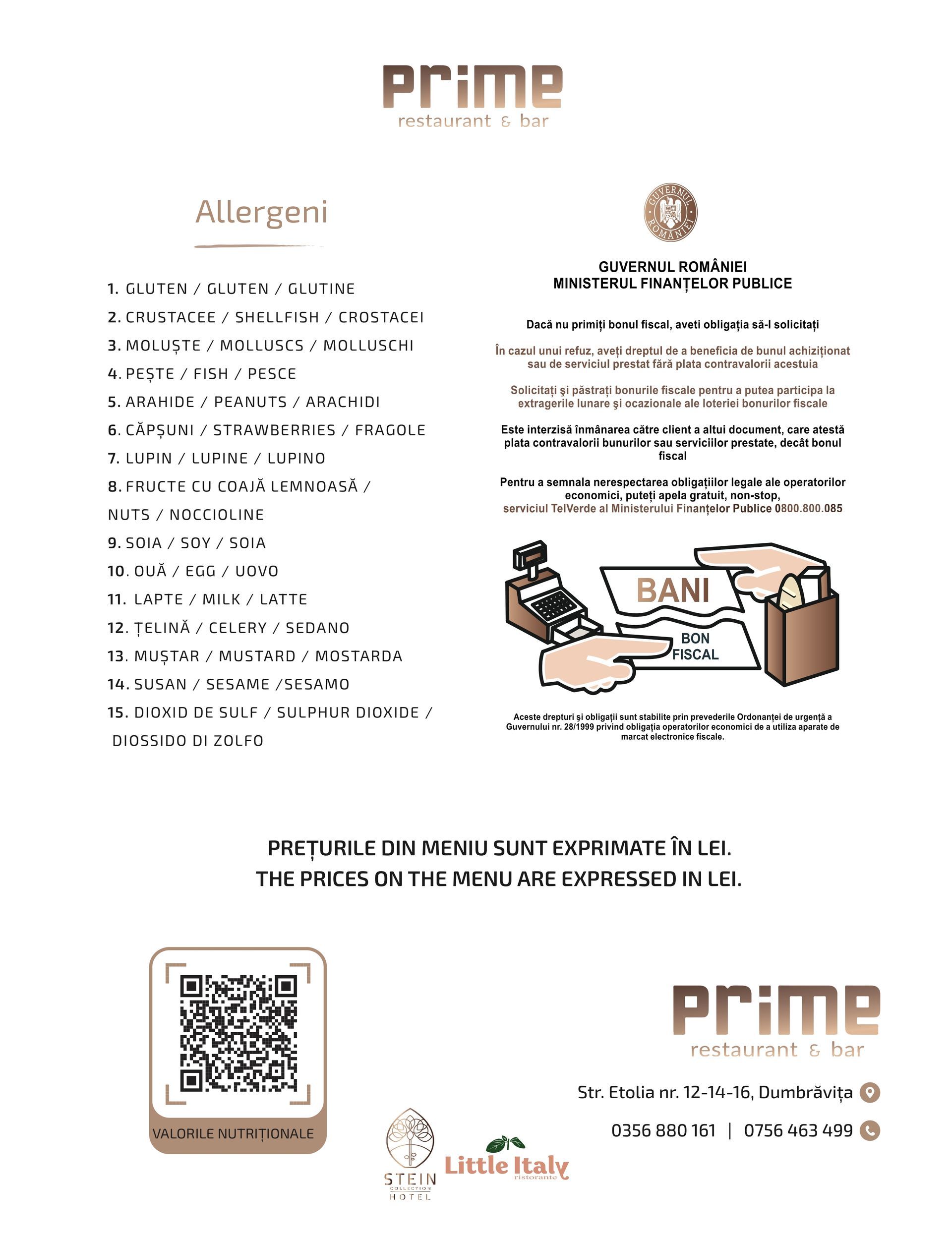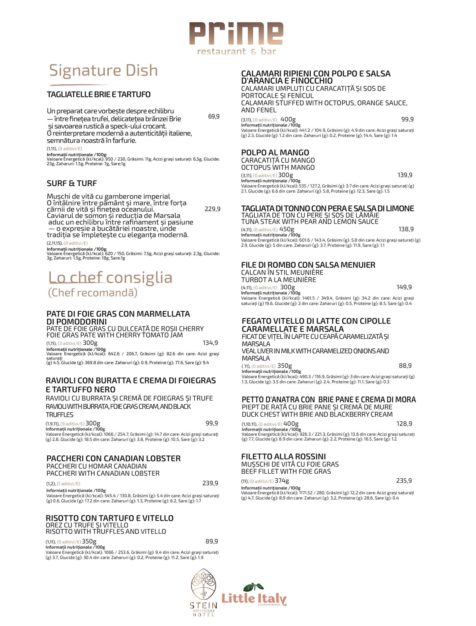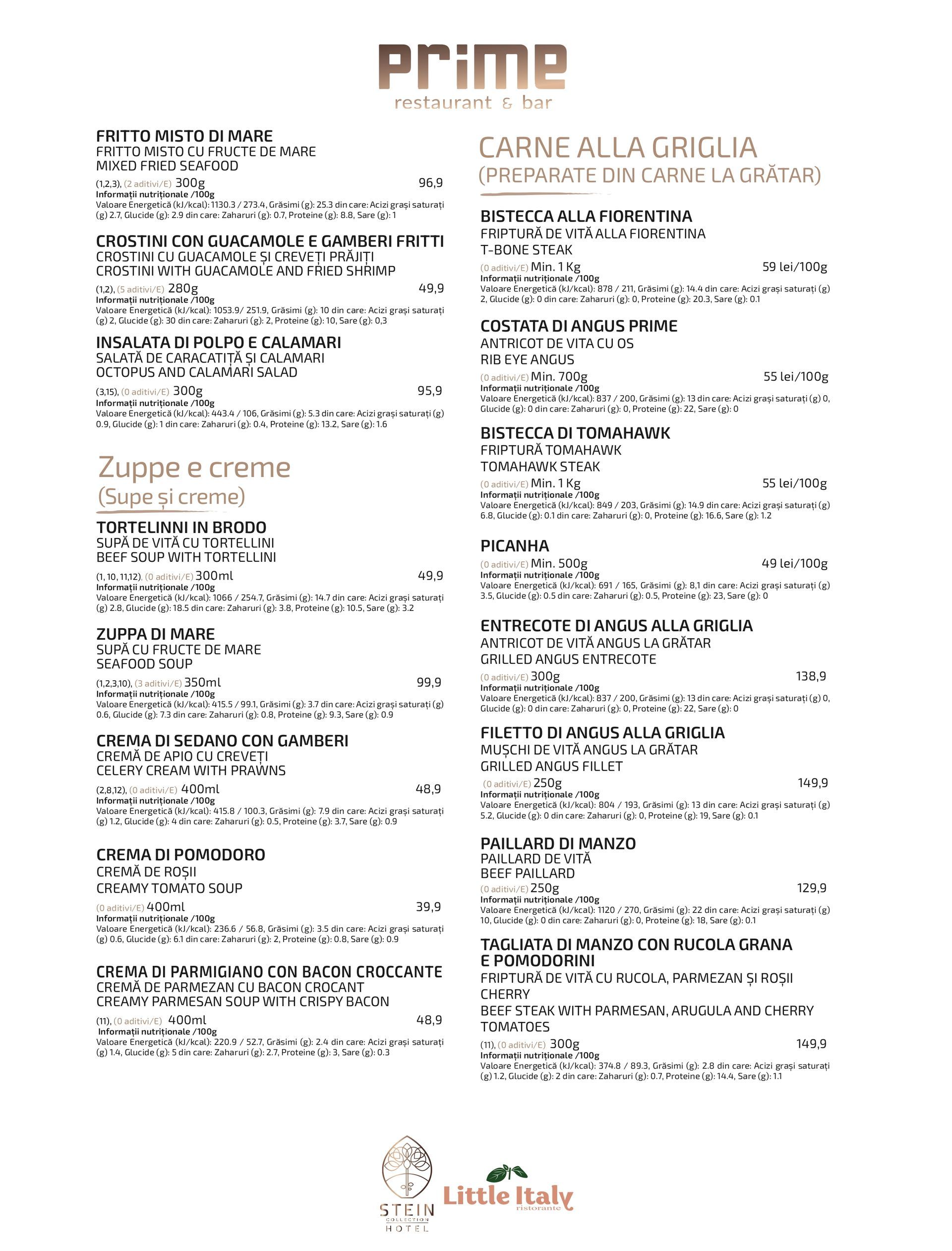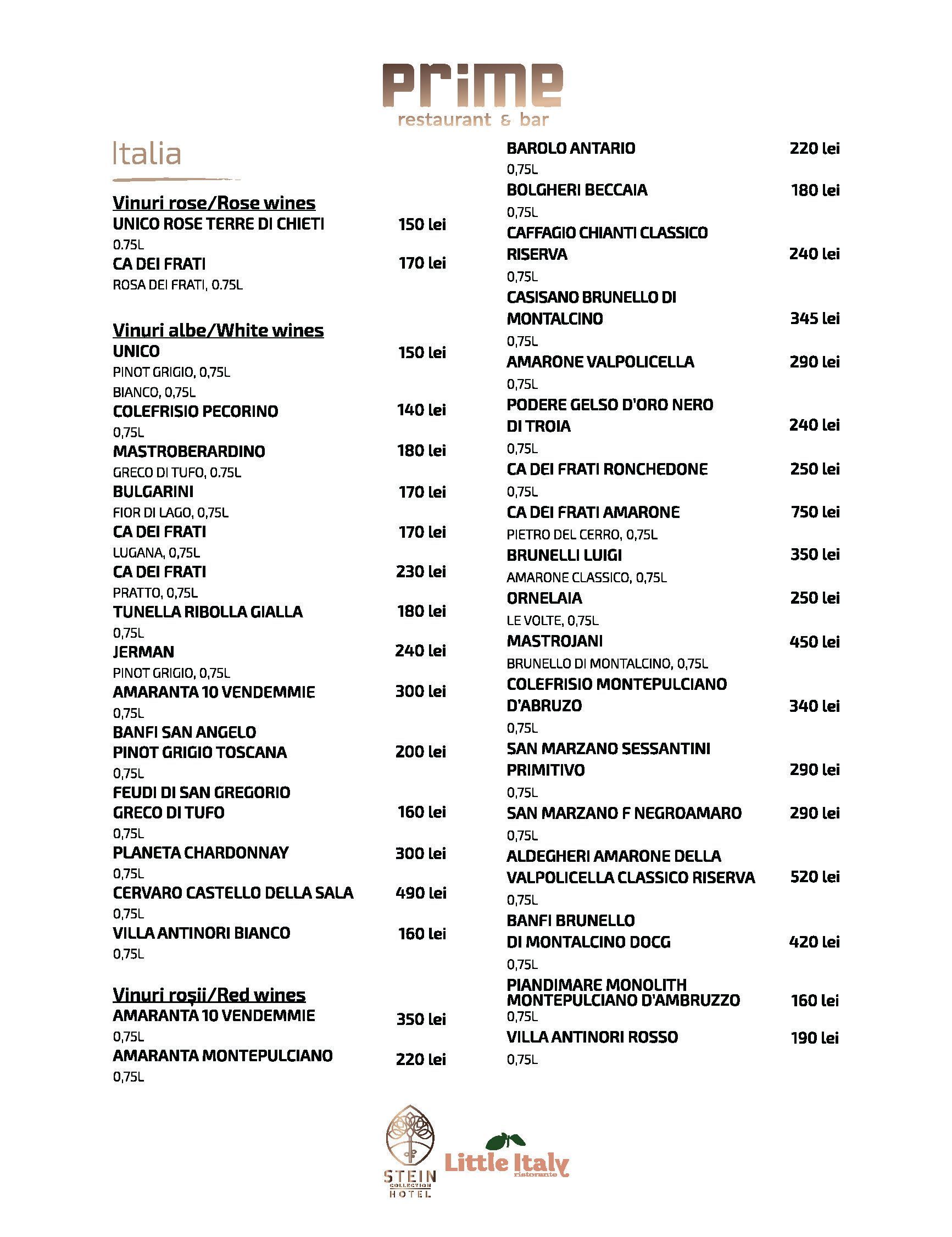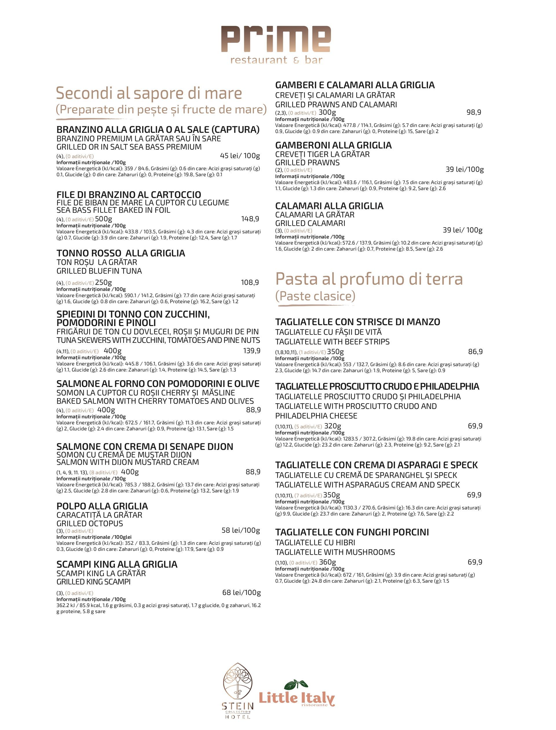 Aici, la The Prime, veți găsi un meniu cu adevărat italian și mediteranean, dezvoltat de bucătarii noștri experți care creează interpretări moderne ale rețetelor clasice italiene și mediteraneene. Folosim doar cele mai bune ingrediente pentru a ne asigura că oaspeții noștri experimentează adevăratele arome ale Mediteranei.
