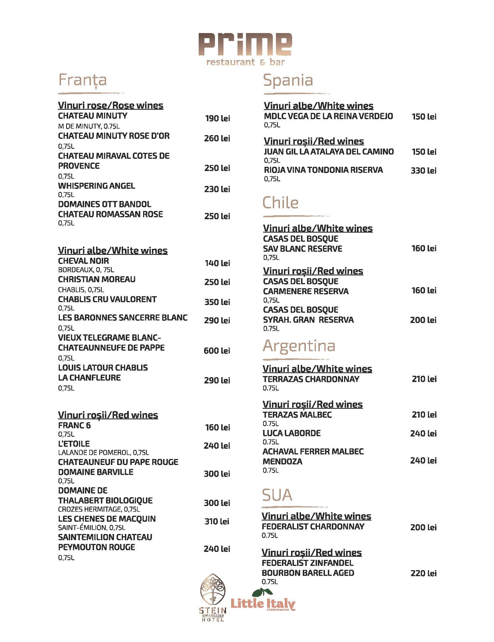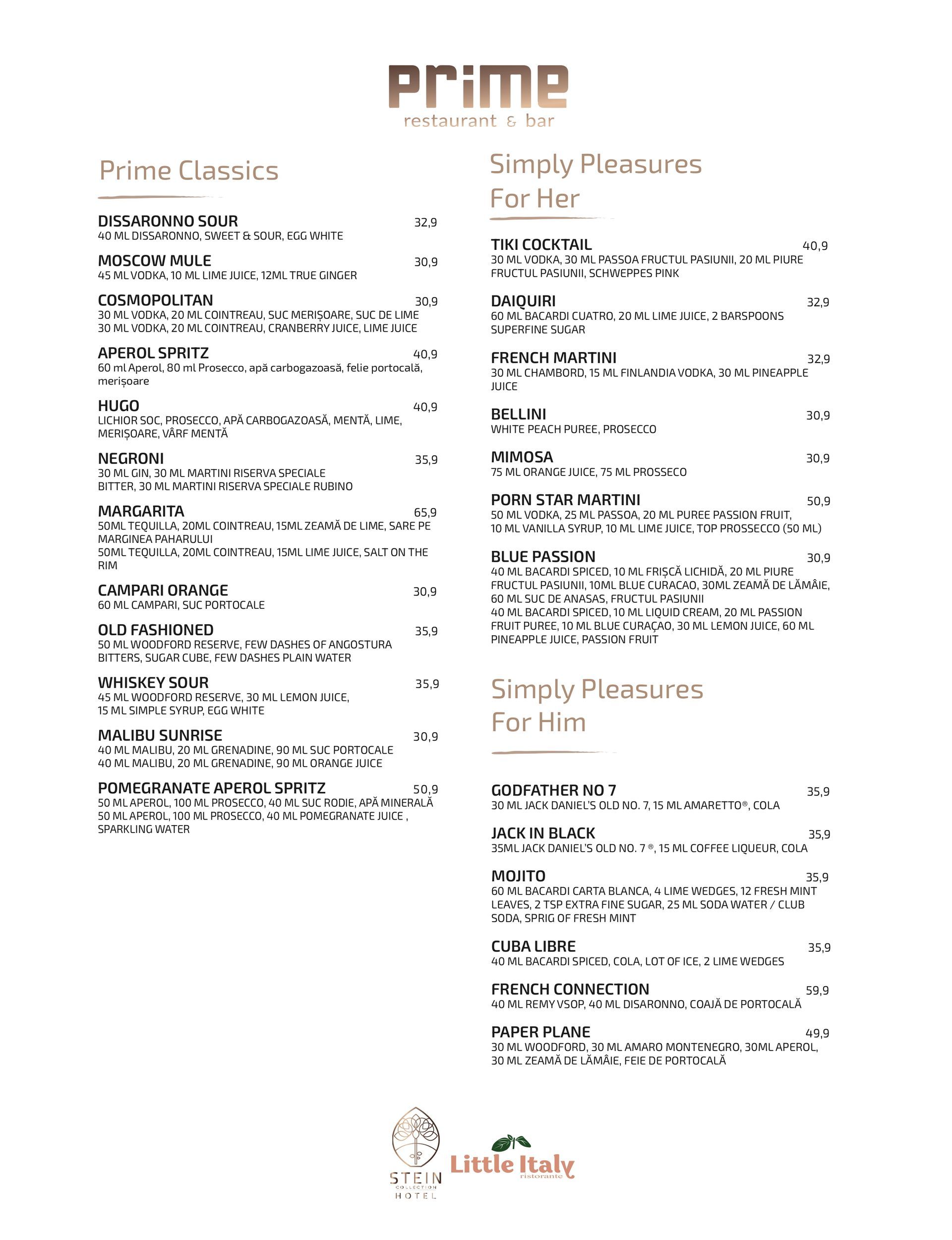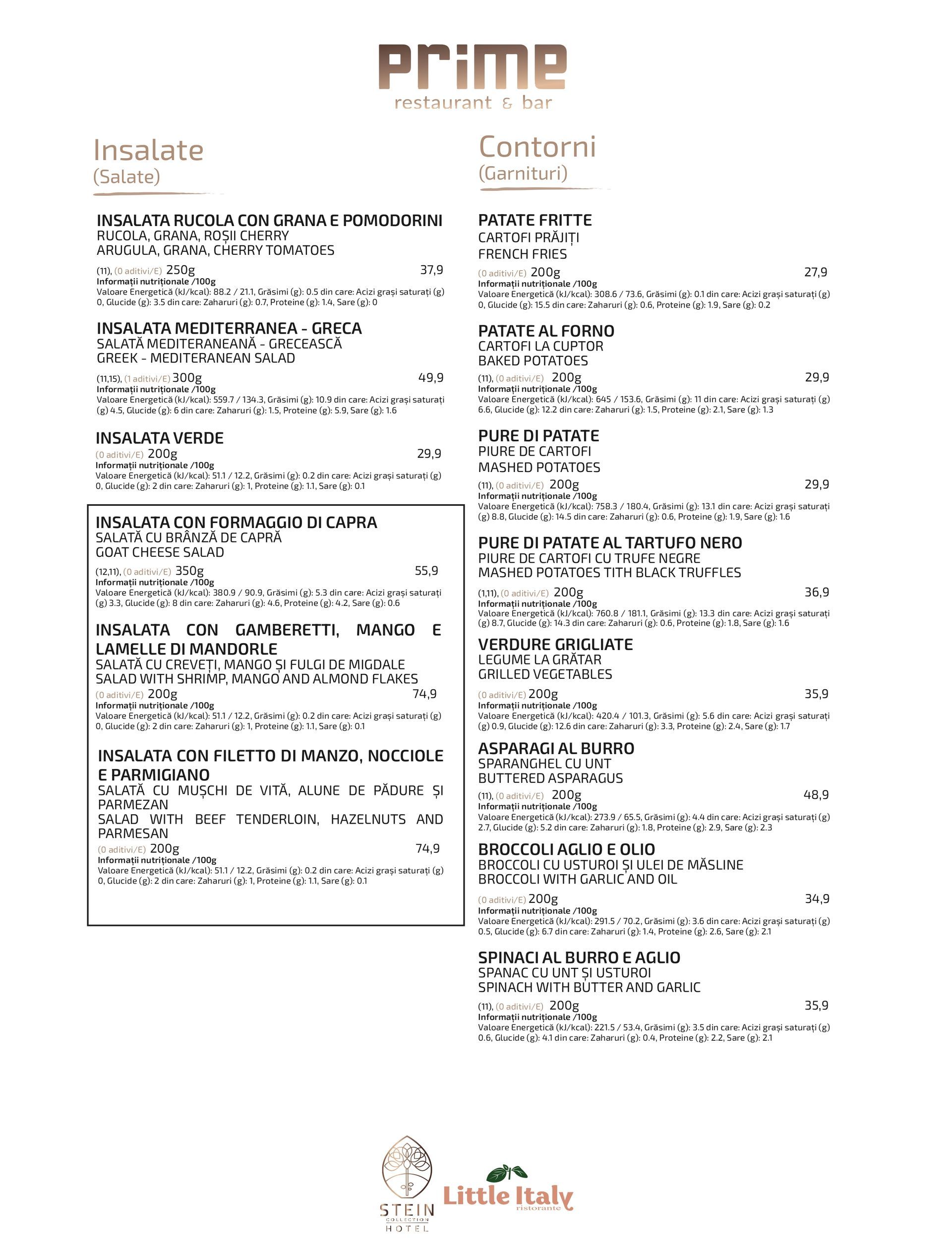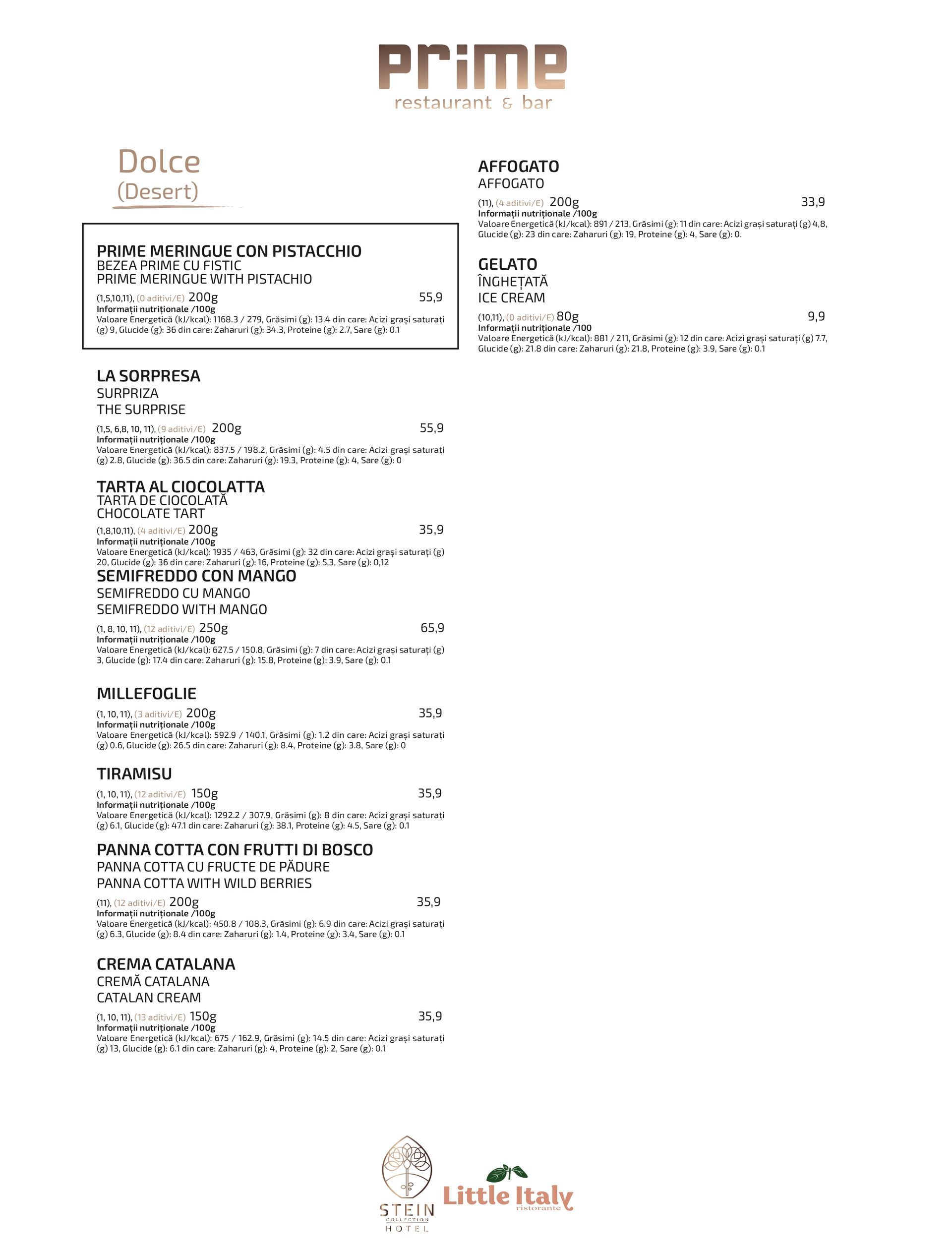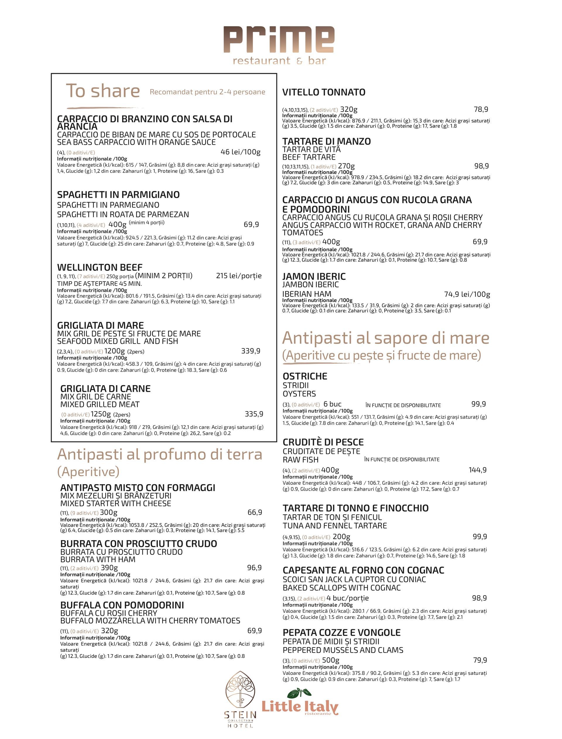 Aici, la The Prime, veți găsi un meniu cu adevărat italian și mediteranean, dezvoltat de bucătarii noștri experți care creează interpretări moderne ale rețetelor clasice italiene și mediteraneene. Folosim doar cele mai bune ingrediente pentru a ne asigura că oaspeții noștri experimentează adevăratele arome ale Mediteranei.
