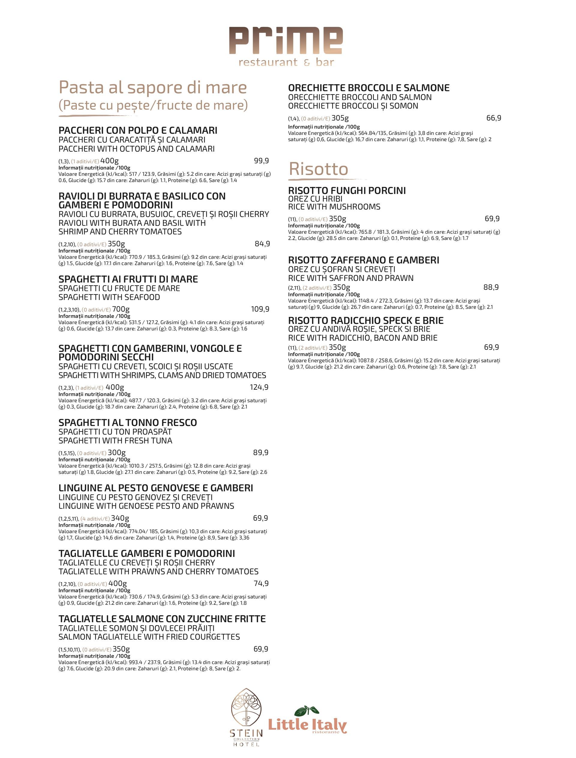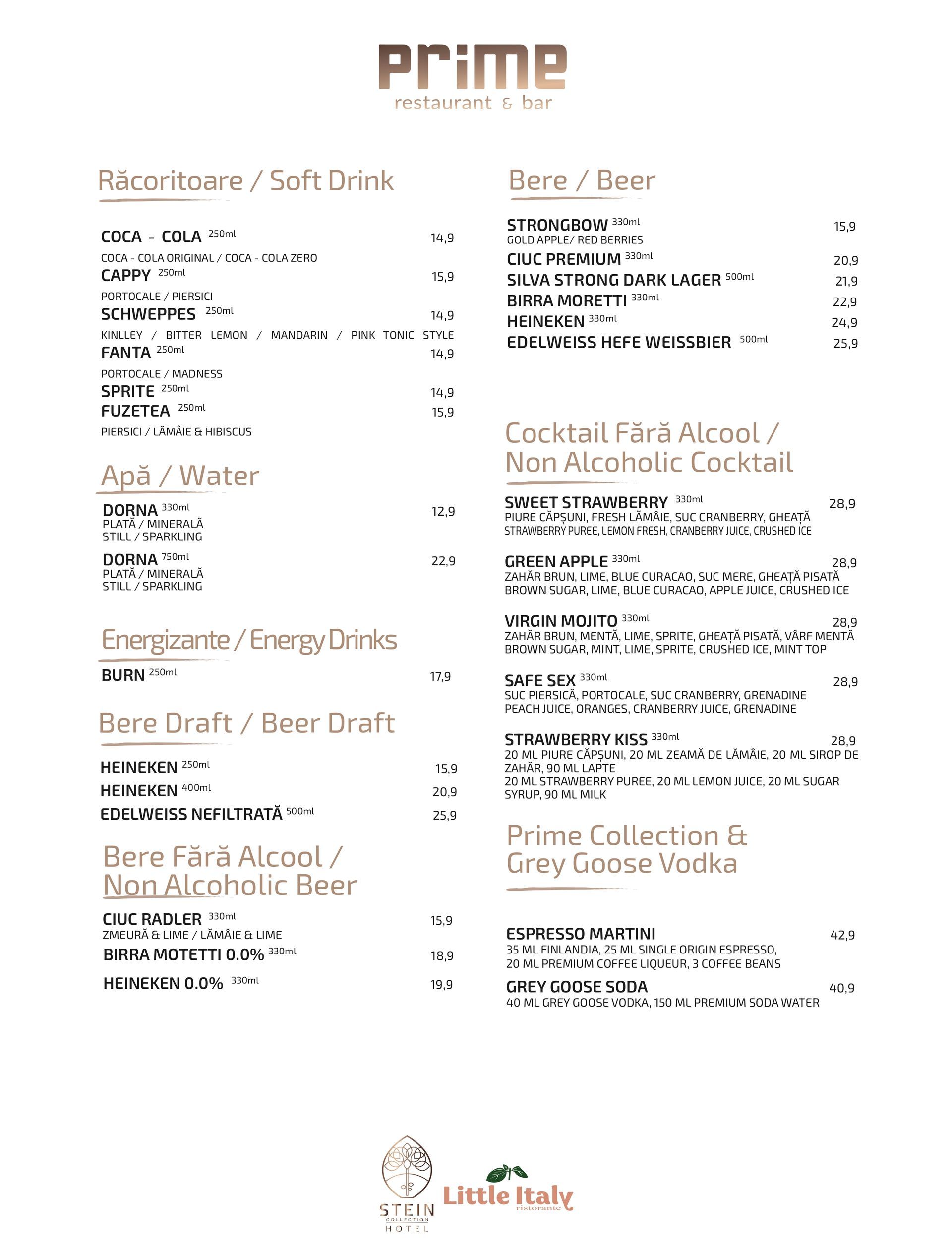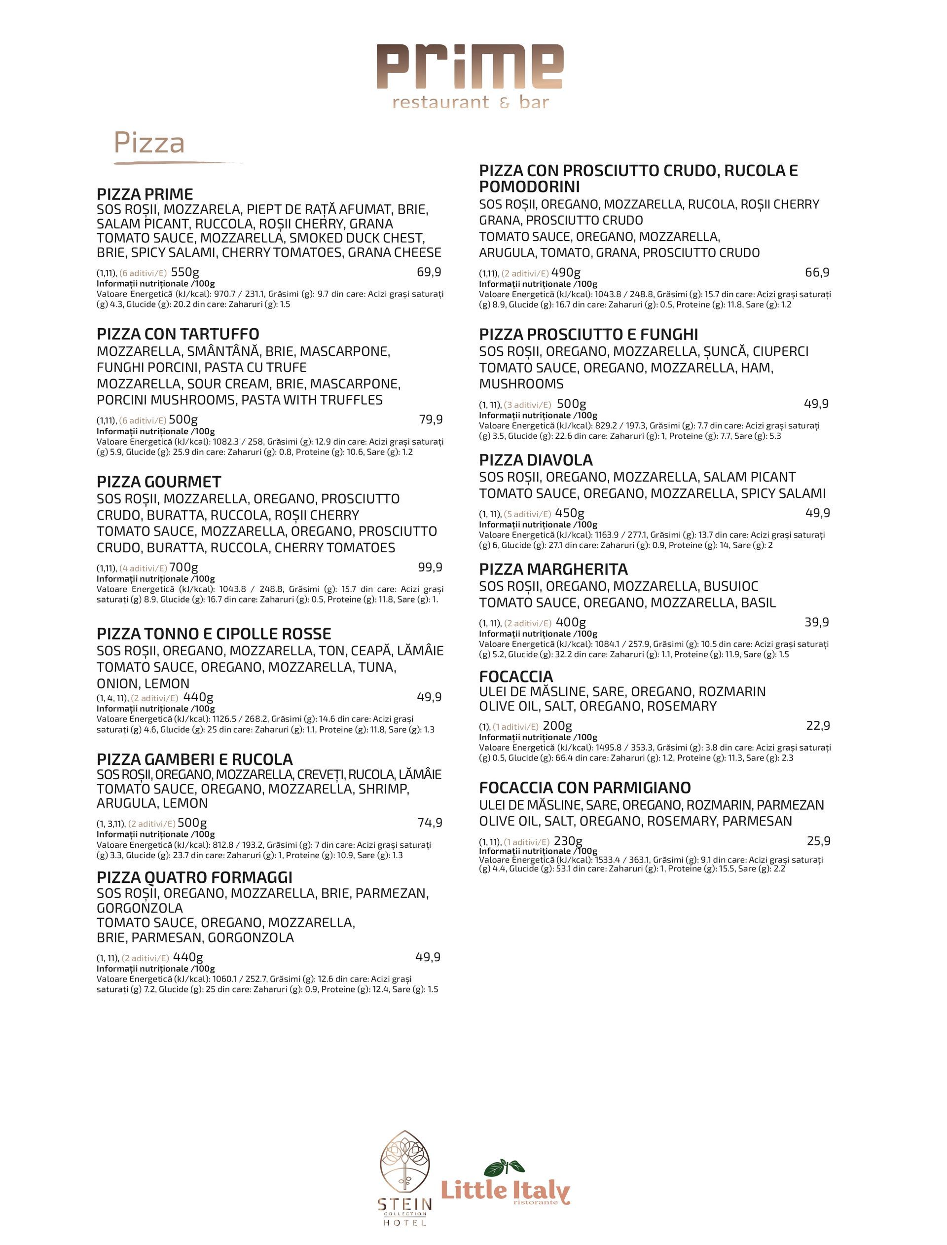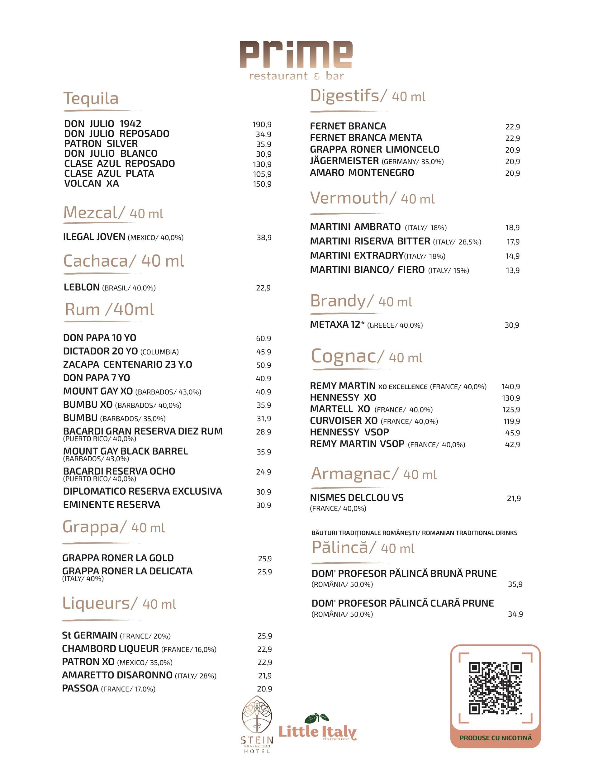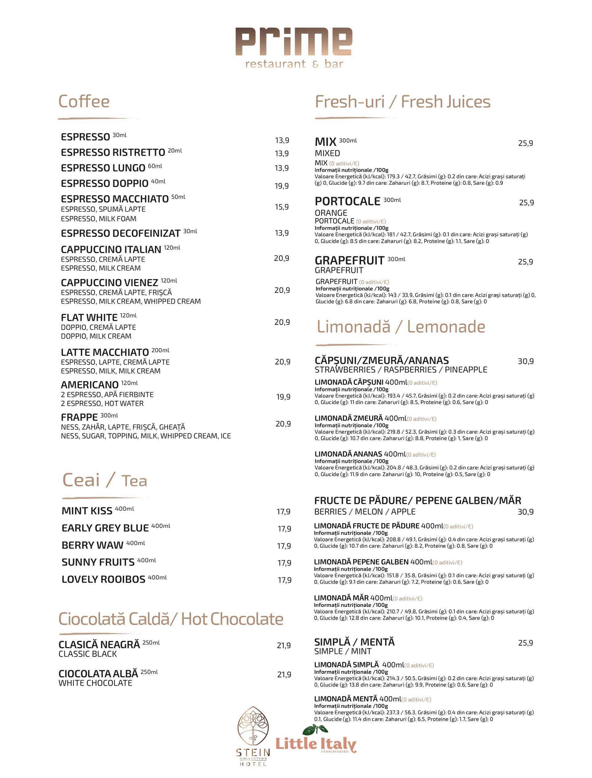 Aici, la The Prime, veți găsi un meniu cu adevărat italian și mediteranean, dezvoltat de bucătarii noștri experți care creează interpretări moderne ale rețetelor clasice italiene și mediteraneene. Folosim doar cele mai bune ingrediente pentru a ne asigura că oaspeții noștri experimentează adevăratele arome ale Mediteranei.